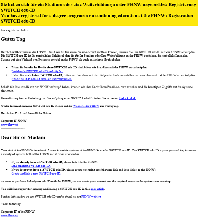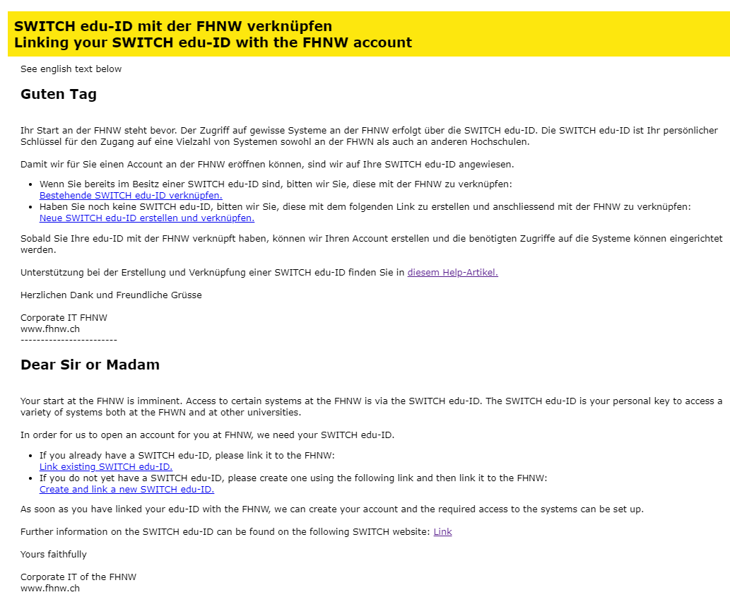 Sie erhalten von der FHNW noreply@fhnw.ch die folgende E-Mail, in der Sie zur Erstellung/Verknüpfung der SWITCH edu-ID mit der FHNW aufgefordert werden. Falls Sie diese Nachricht nicht erhalten, bitten wir Sie, Ihren Spam oder Junk-E-Mail-Ordner zu prüfen und gegebenenfalls den Filter Ihres E-Mailprogramms anzupassen.