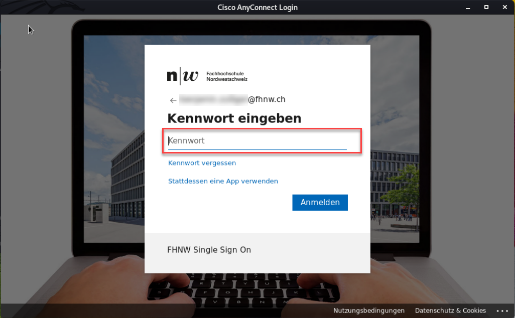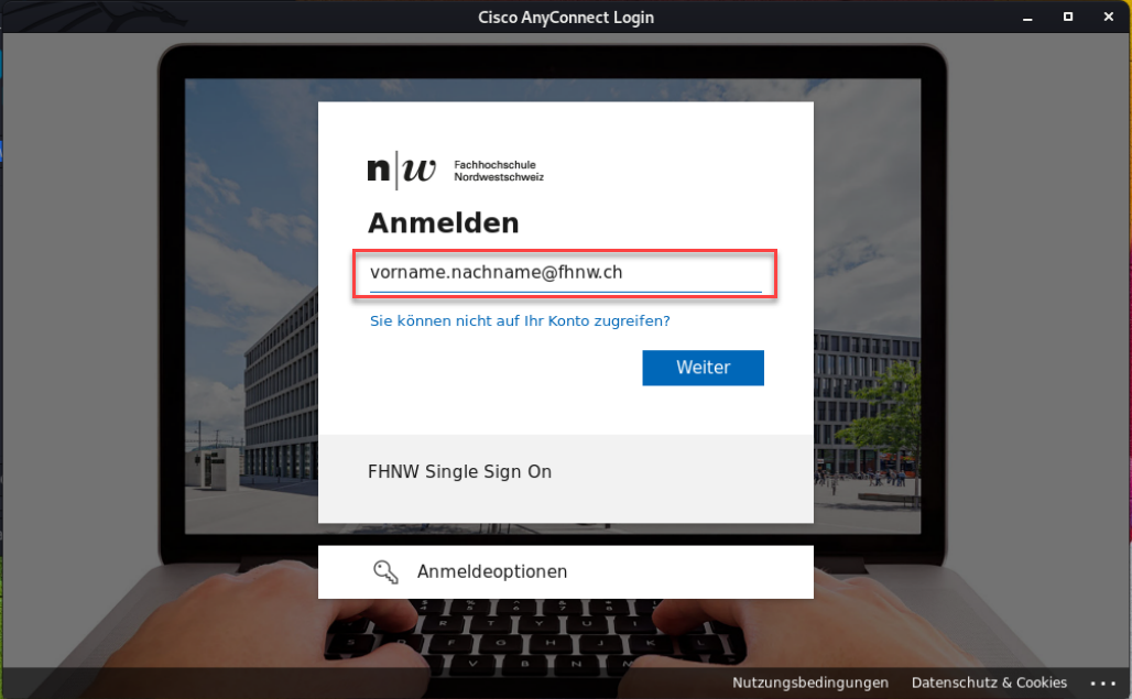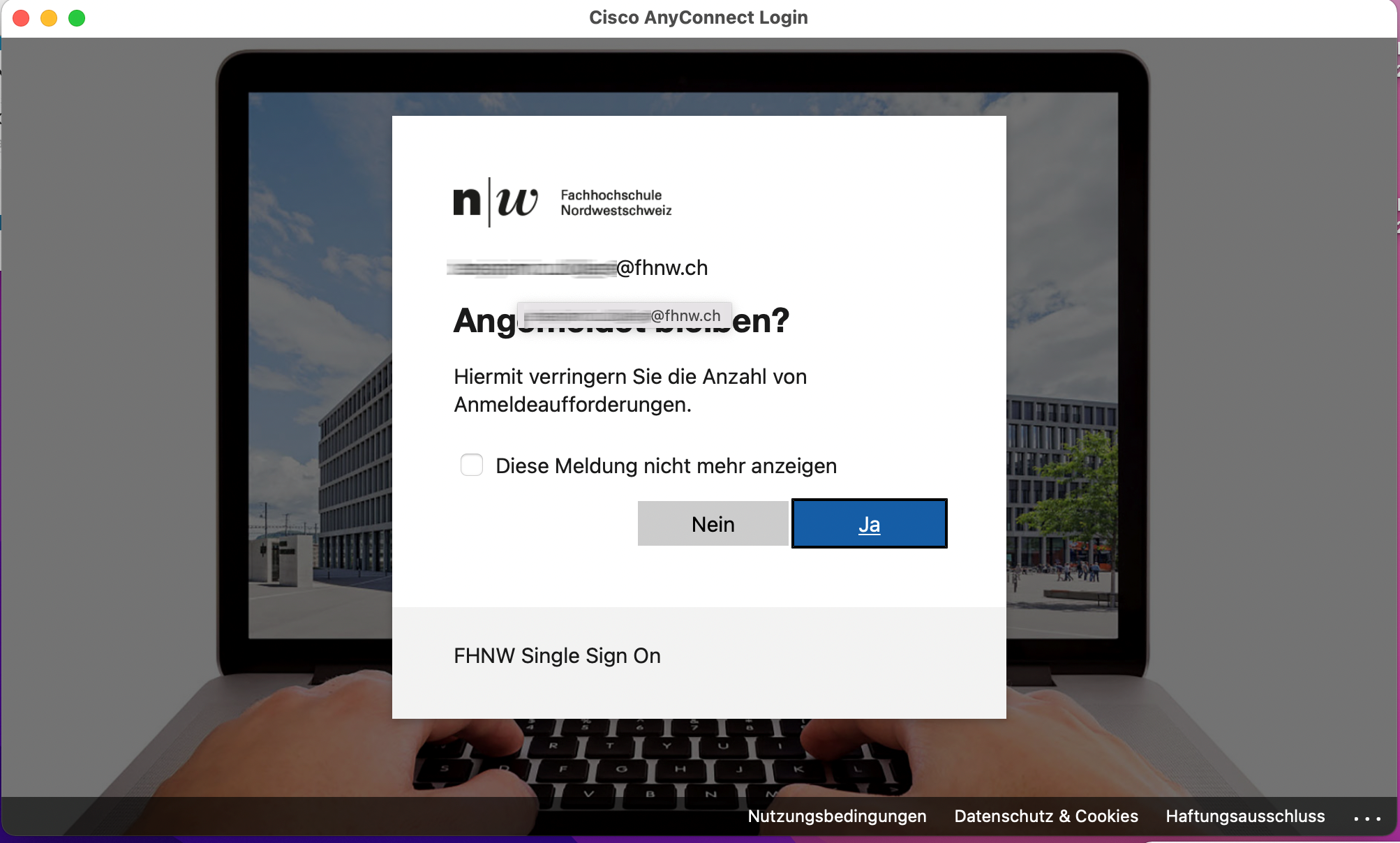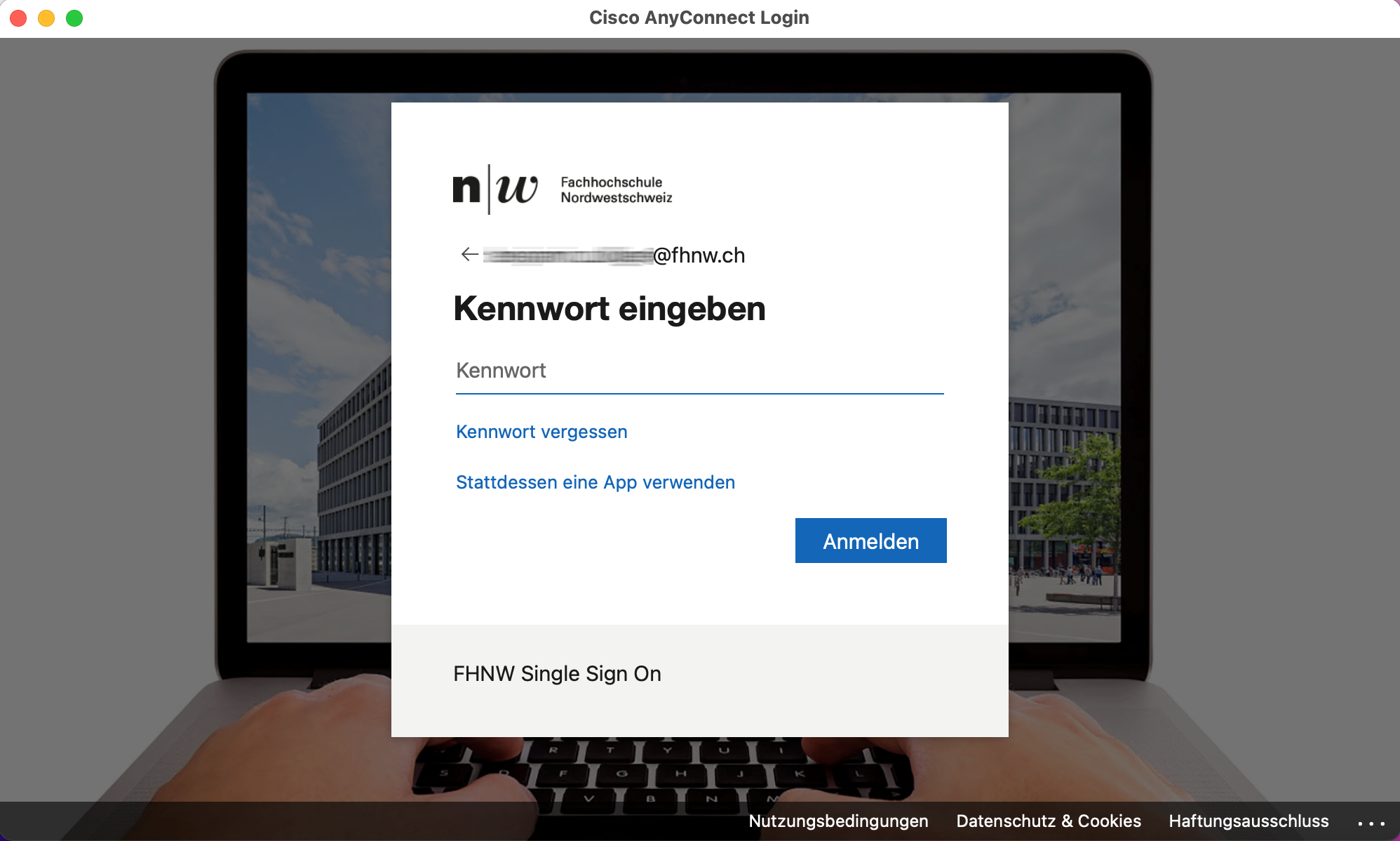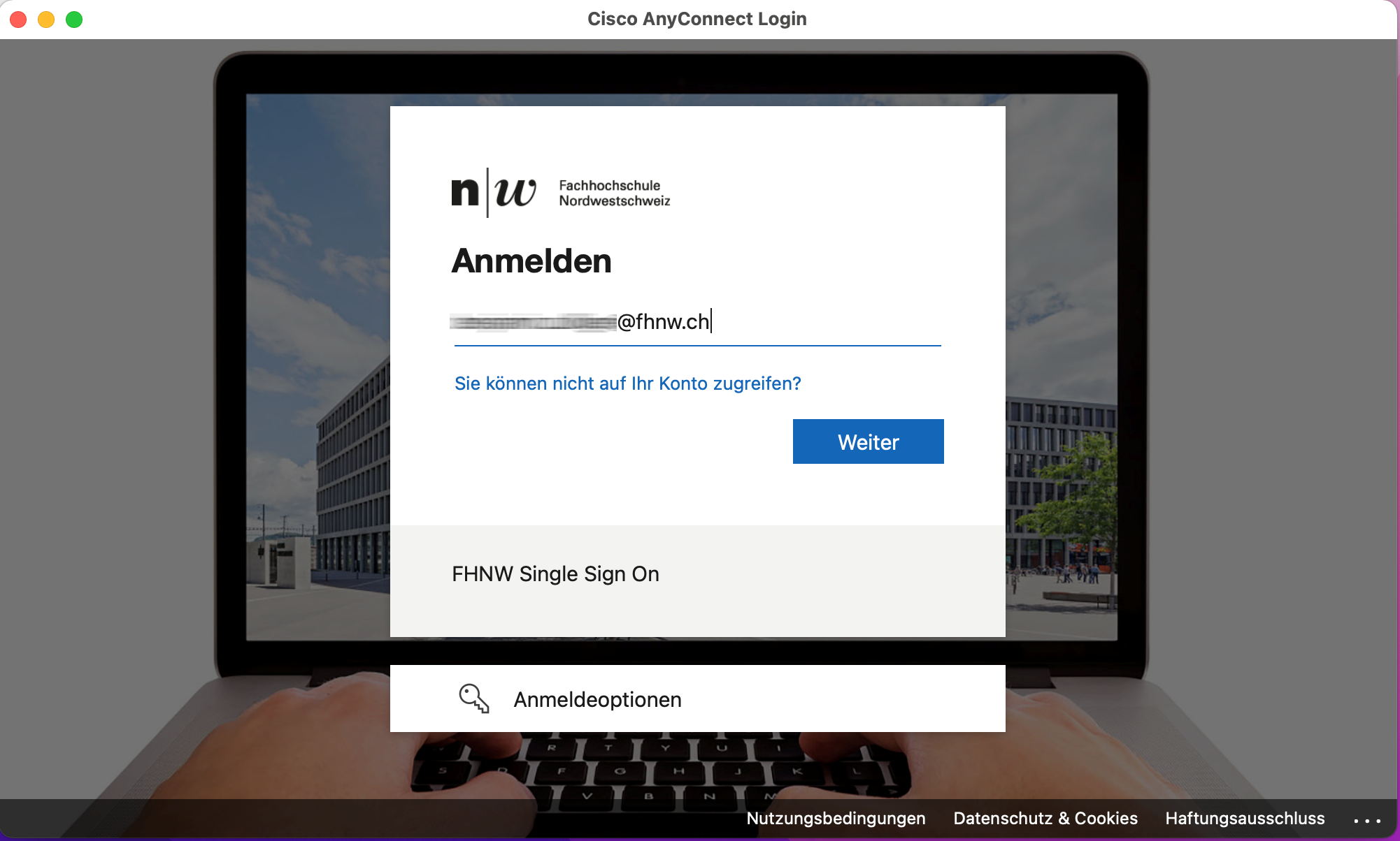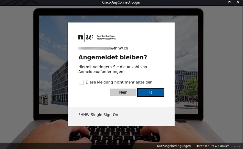 Grund: Cisco Secure Client ist so konfiguriert dass er die bestehende Azure Anmeldung verwendet. Bei nicht FHNW Geräten kann es sein dass er den falschen Account nimmt und man gar keine Möglichkeit hat dies zu ändern.