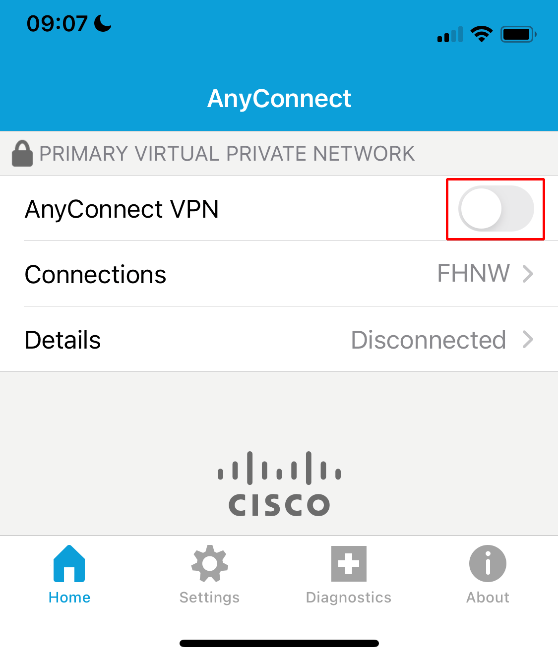 5. Aktivieren Sie die VPN Verbindung, indem Sie den Schieber (rechts von AnyConnectVPN) nach rechts schieben.