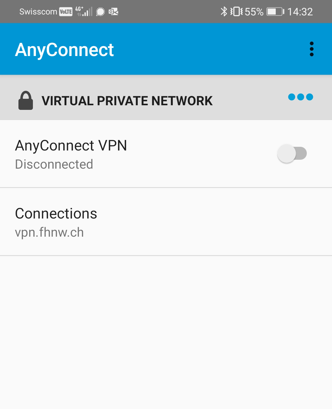 Um den Cisco AnyConnect Client auf einem Android Smartphone oder Tablet zu nutzen, muss zuerst die App aus dem App Store heruntergeladen werden. https://play.google.com/store/apps/details?id=com.cisco.anyconnect.vpn.android.avf Bitte verwenden Sie keine alternativen App Stores, da in diesen oftmals Malware verteilt wird.