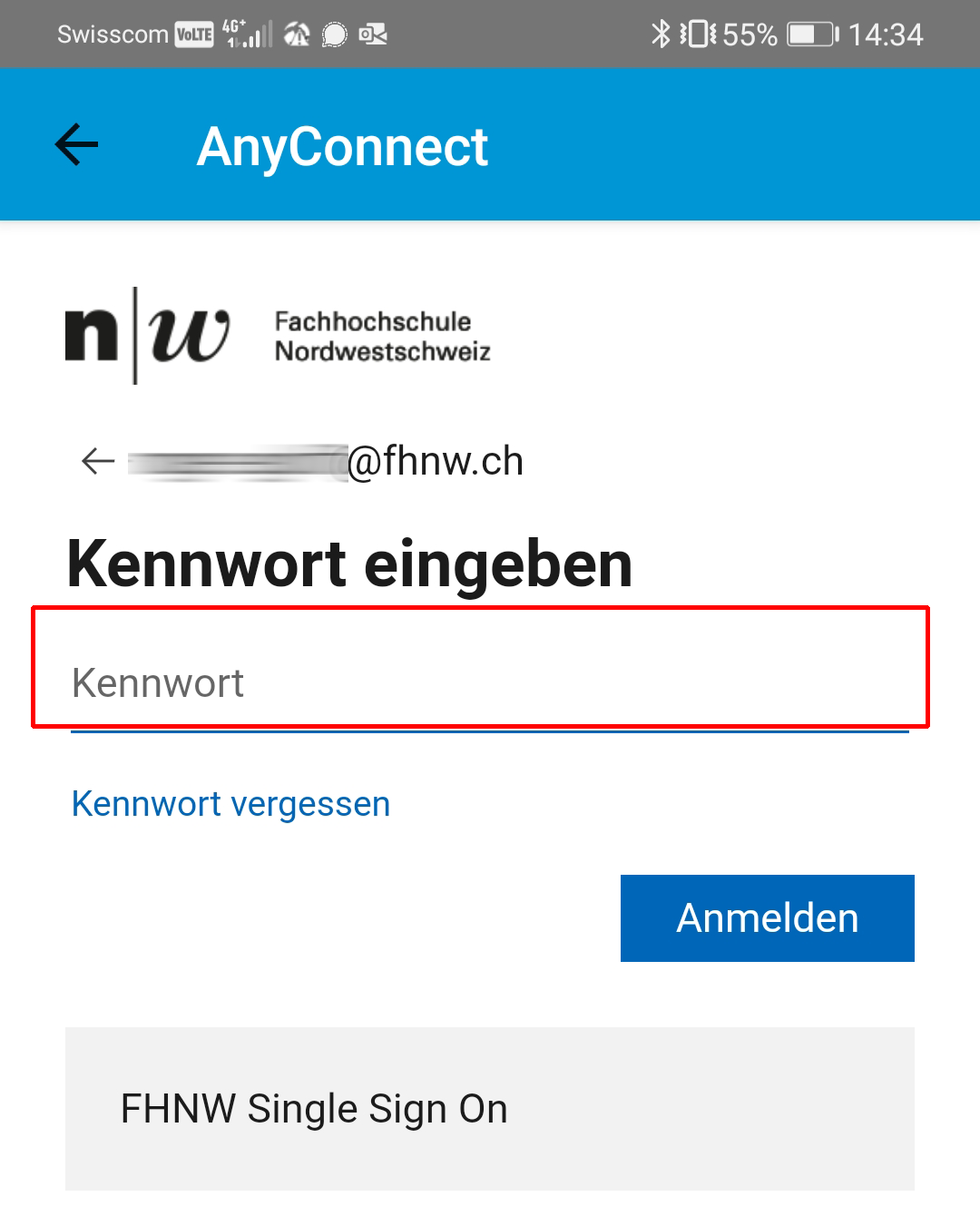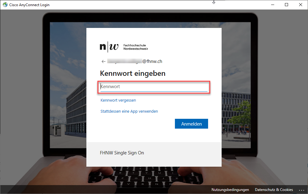7. Geben Sie als ersten Faktor Ihr FHNW-Passwort ein und klicken Sie anschliessend auf "Anmelden"