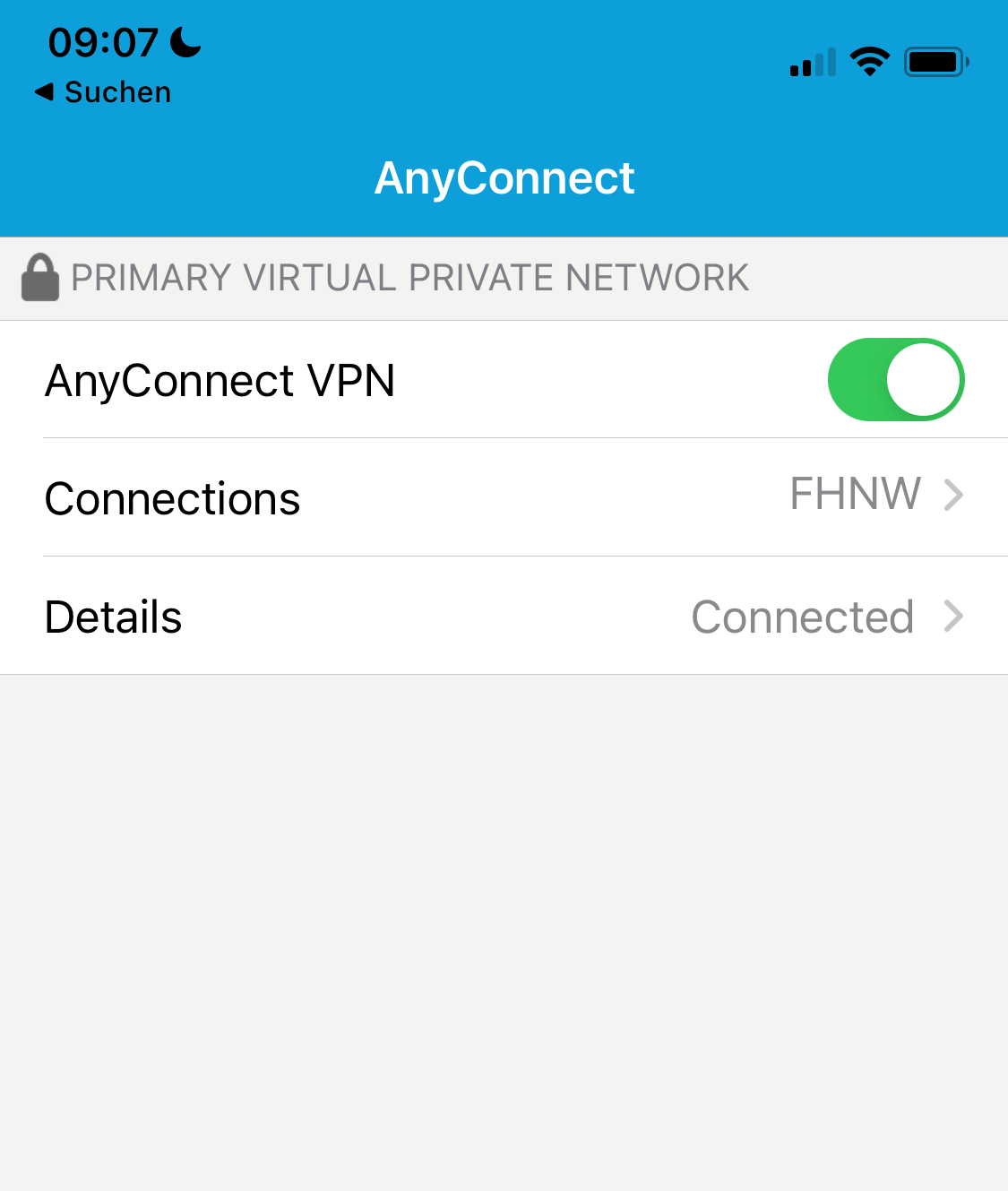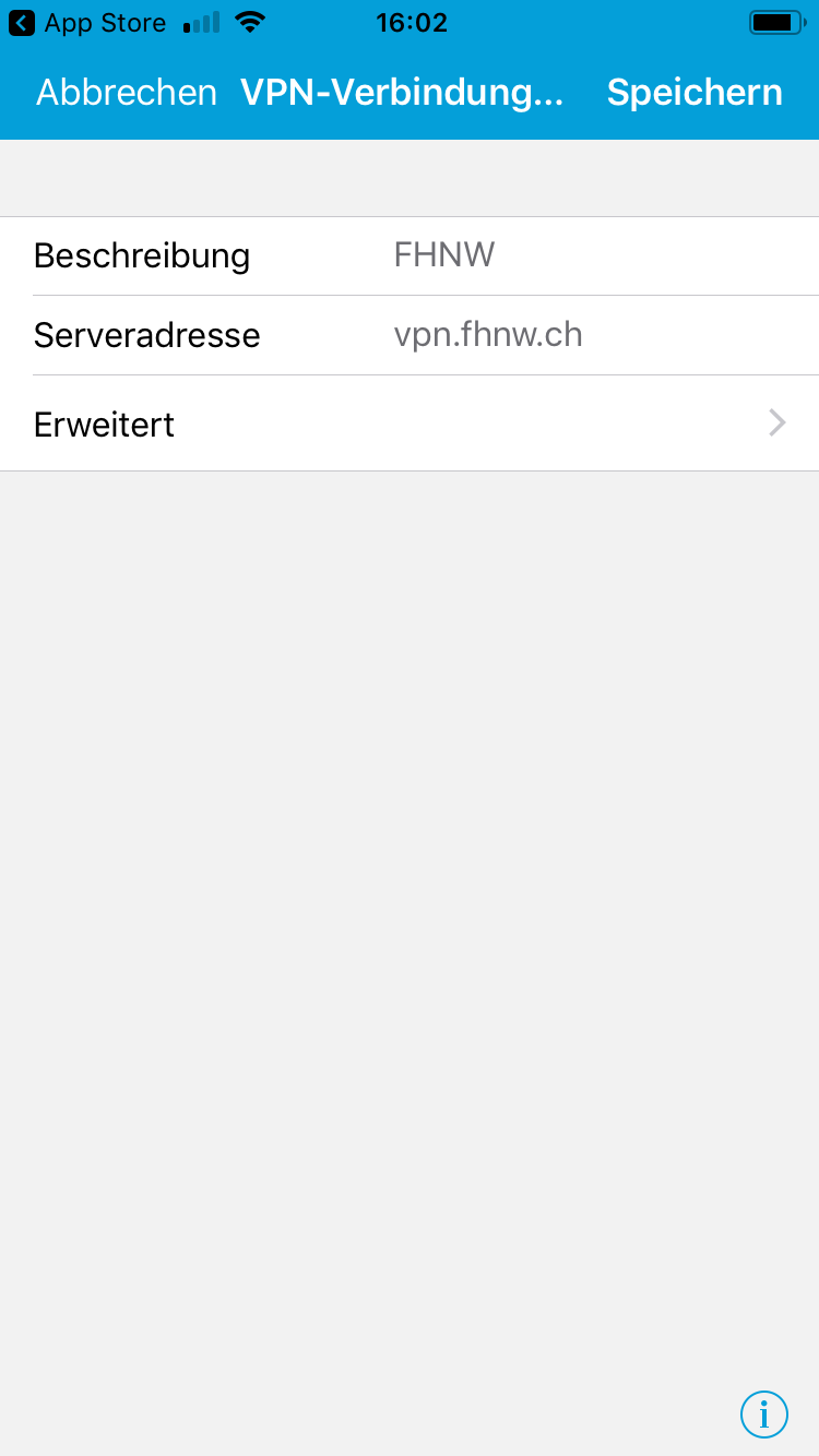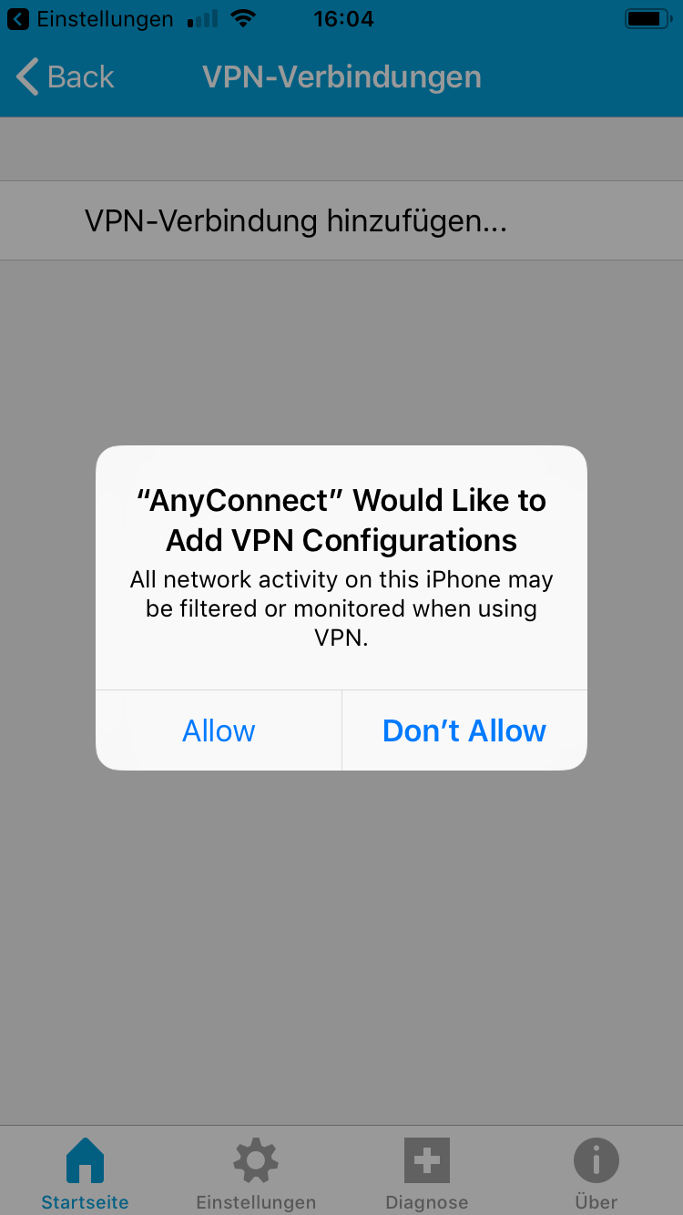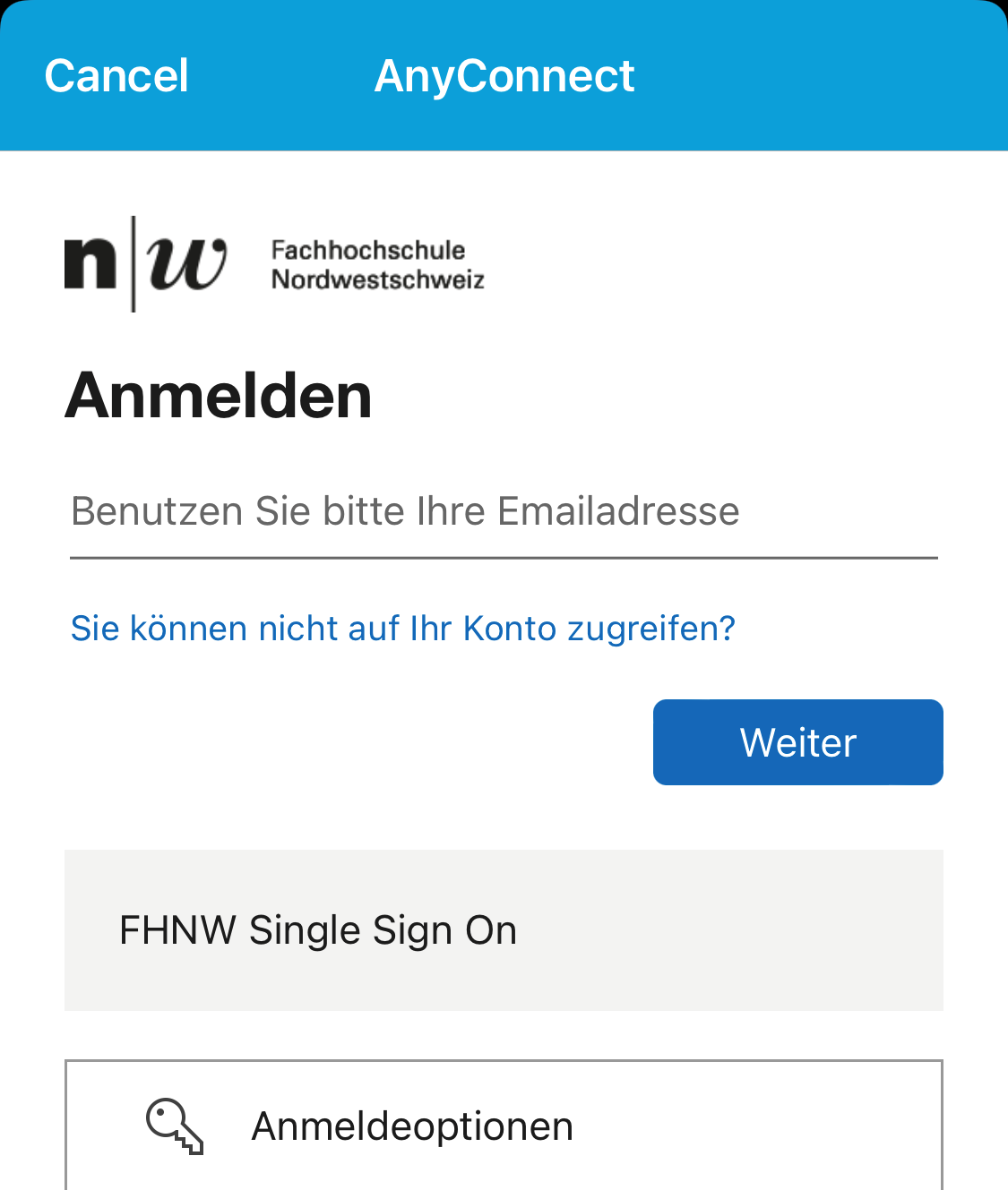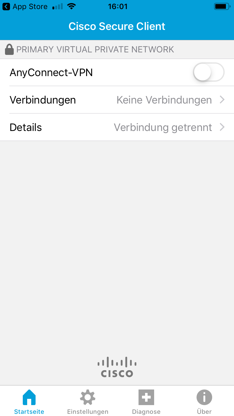 Um den Cisco AnyConnect Client auf einem iPhone oder iPad zu nutzen, muss zuerst die App aus dem Apple App Store heruntergeladen werden. https://apps.apple.com/de/app/cisco-anyconnect/id1135064690