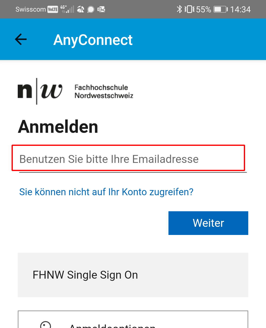 6. Tippen Sie Ihre FHNW-E-Mailadresse ein und klicken Sie auf "Weiter"