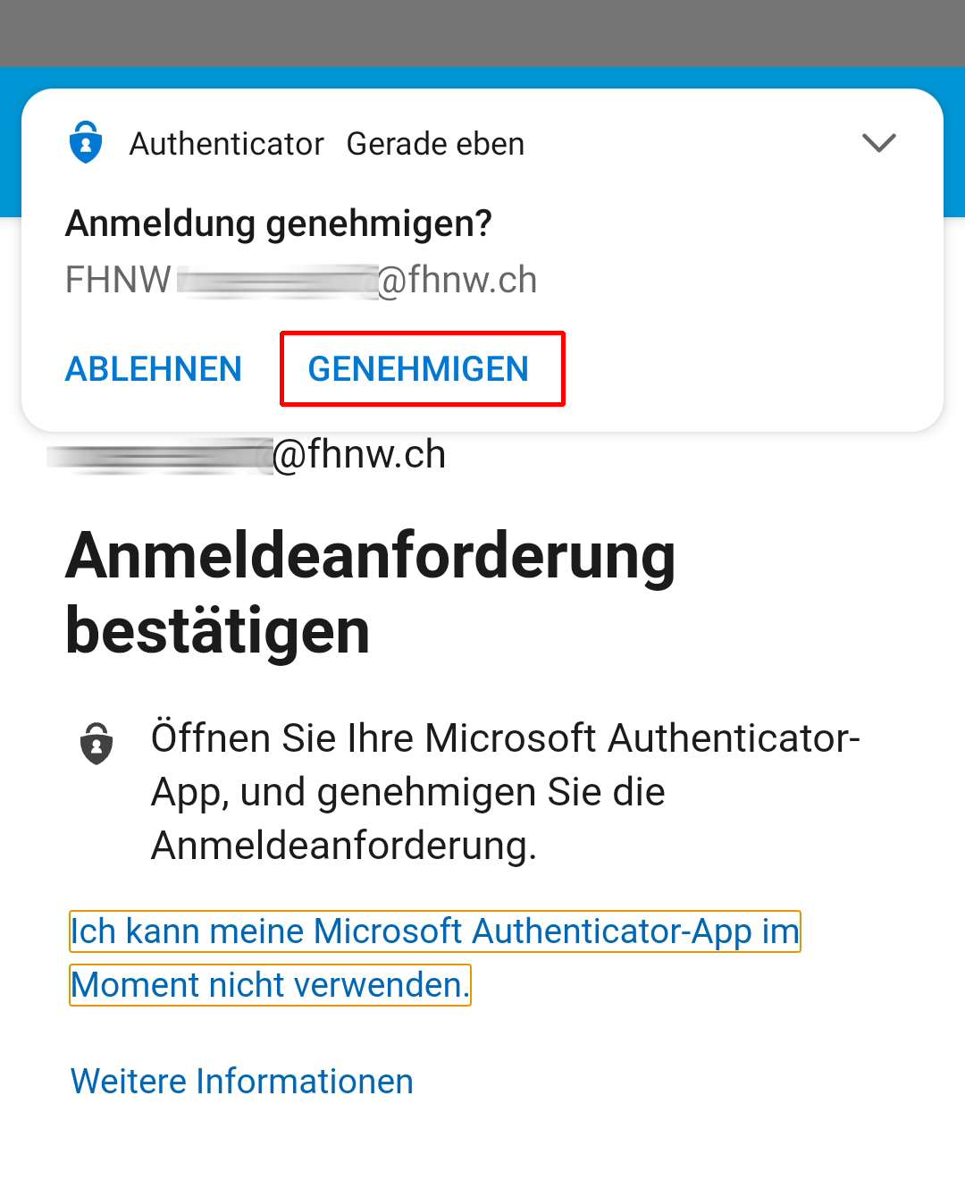 8. Wechseln Sie zur Authenticator App und kopieren Sie den Authenticator Code. Fügen Sie diesen in diesem Fenster ein oder kopieren Sie den Zahlencode aus der SMS oder bestätigen Sie die Anmeldung in Ihrer Authenticator App.