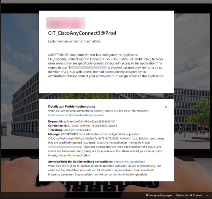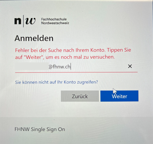 Grund: Der Fehler tritt nur bei nicht FHNW Geräten auf und auch nur dann, wenn das Gerät mit einem anderen Azure Active Directory als der FHNW verbunden ist.
