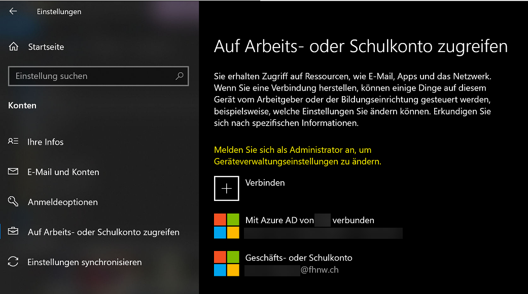 Vorgehen: Registrieren Sie das FHNW Konto als Arbeits- und Schulkonto in den Einstellungen --> Konten --> "Auf Arbeits- oder Schulkonto zugreifen" --> Verbinden wählen. Gleiches Vorgehen wie oben.