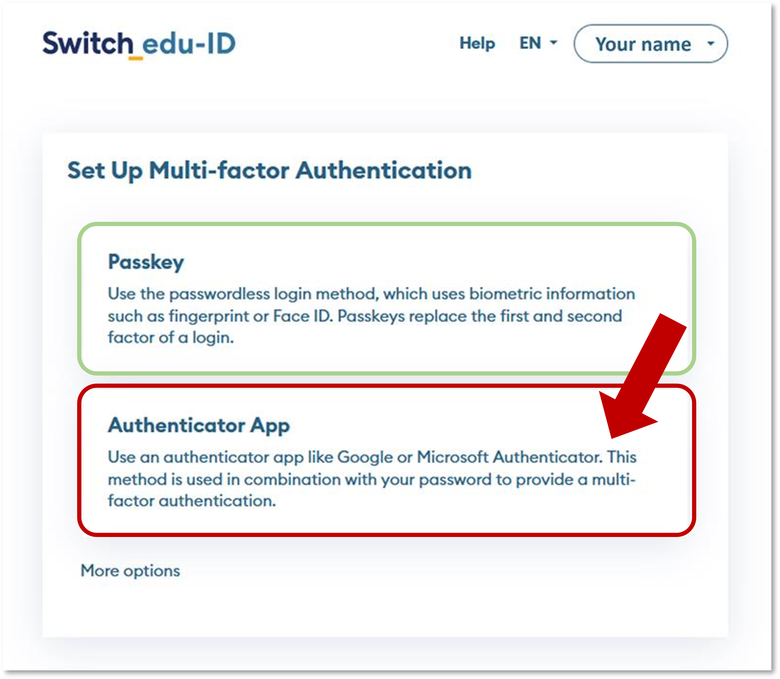 We primarily recommend using an authenticator app. However, you can also select a passkey or